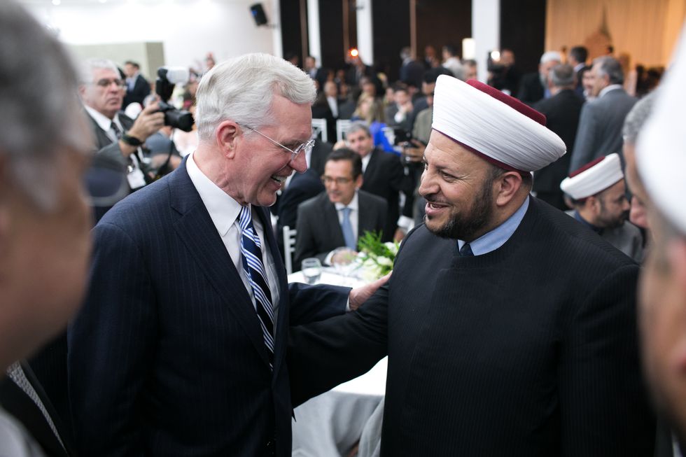 In this image from an article on Mormon Newsroom, the caption reads: "Elder Christofferson, a member of the Quorum of the Twelve Apostles of The Church of Jesus Christ of Latter-day Saints, spoke about basic principles of religious freedom and the need for vigilance and cooperation to preserve it. Here, he visits with Sheikh Dr. Abdelhamid Metwally, the main religious leader in the oldest Mosque in Latin America. The Brazil Mosque was the location of Elder Christofferson's speech.”