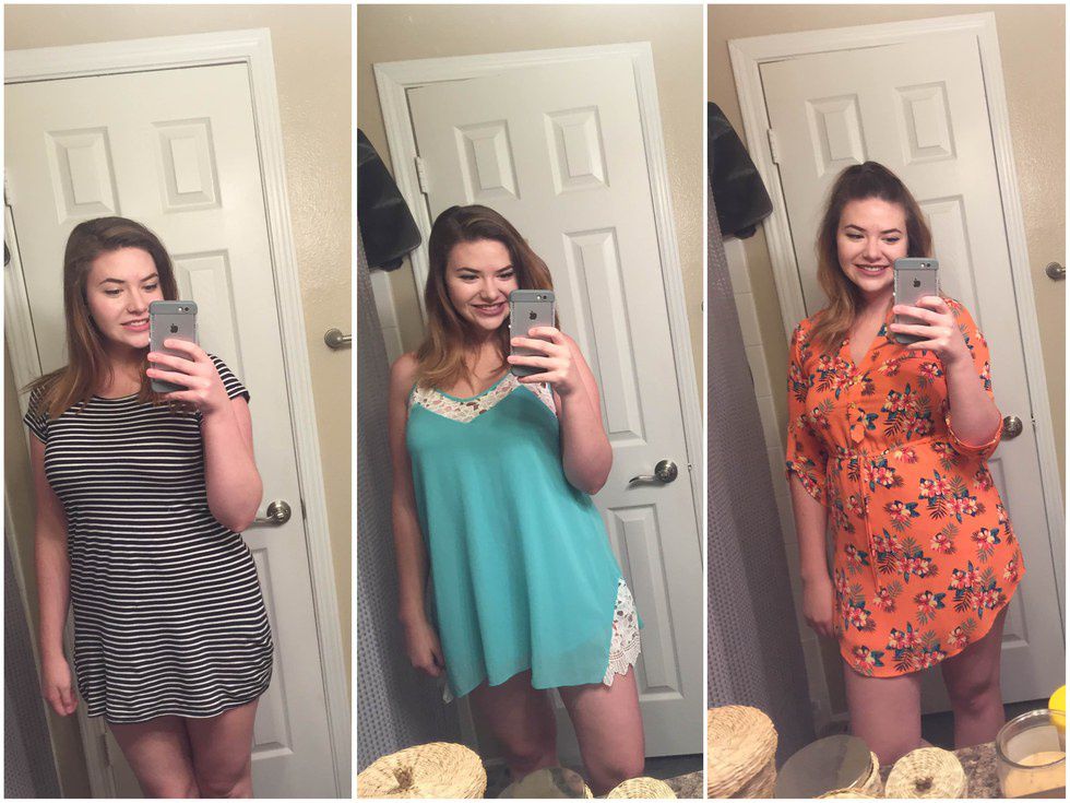 I didn't realize until I put all these pictures together that he chose these dresses because it involved absolutely no effort in matching *insert eye roll*. Anyway, I like all these dresses, but they are ridiculously short and are not fun to hike around campus in. Once again my boyfriend has never had to deal with short clothes that could rise up and flash the world, it's something he as a man has never had to deal with. Due to the short nature of these dresses I felt cute, but I was definitely uncomfortable all day in them.
