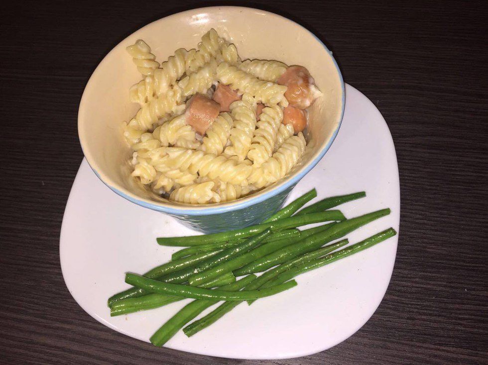 Attempt #1: Pasta with what I think is pork sausage?? And also some type of grated cheese blend that I added milk to in order to make some type of fake mac-n-cheese. The cheese was okay, but had a weird aftertaste...and green beans because I can't disappoint my mom like that.