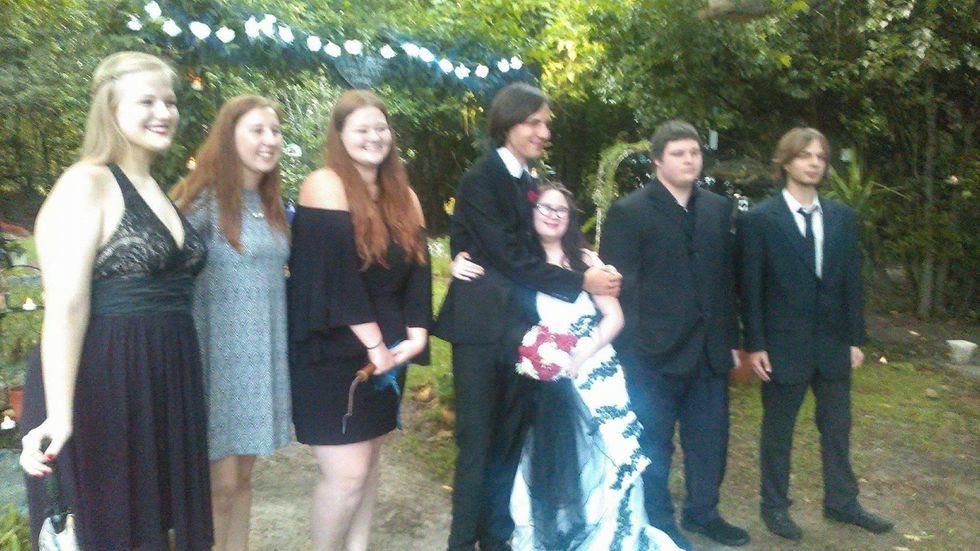 At 19 years old on our 3 year anniversary I married my high school sweetheart and true love. We held the ceremony in his mother's backyard among our closest friends and family. Just before the ceremony started I was still getting ready because we'd spent the whole day setting up and cooking ourselves and it was raining outside. It was still slightly drizzling by the time things were ready to start so my bridesmaids carried umbrellas instead of bouquets and caused a double rainbow to appear in the sky right after he dip-kissed the bride. Getting married in college has been a difficult journey. It's turned me into a commuter and a wife simultaneously and even though I'm working while others are attending back to school events and late nights getting back home requires even more work for my assignments, I wouldn't trade any of it for the world.