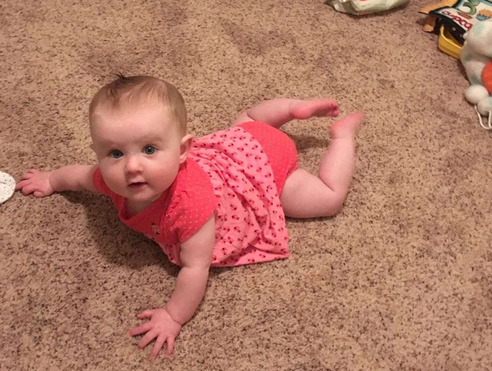 Hallie is now six months old. I might be a little biased, but Hallie is incredibly smart. She learns quickly and has hit many milestones. She has become a pro at rolling over: she rolls all around the room every time she is laid down. She has a pretty, gummy smile and has the cutest laugh. She learned how to use her hands, so now she loves to play with her many different toys and can hold her bottle all by herself. Hallie loves to hold hands and give big hugs. She is still working on sitting up on her own and just now getting to taste of orange vegetables; she really likes sweet potatoes and carrots! She loves Disney music and loves to laugh, sing, dance, and talk. Hallie is a very sweet and easy going baby and everyone loves her to death!