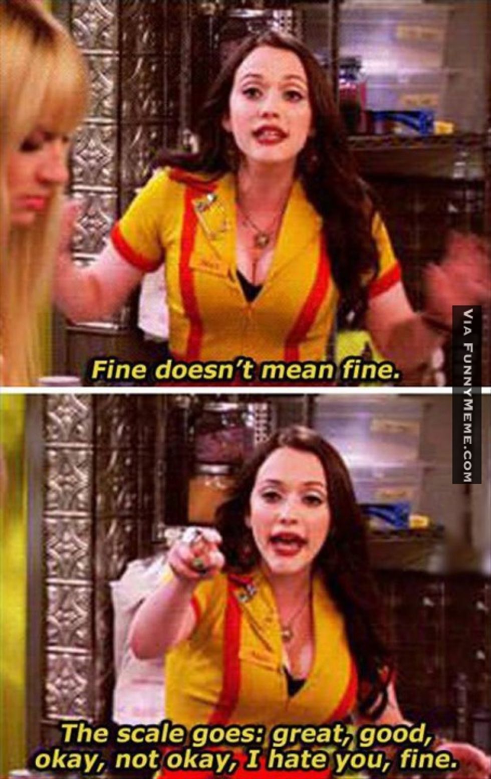 Fine: This one is a classic. It's a pretty valid assumption that 99.9% of the time a girl says "I am fine" she is so not fine.