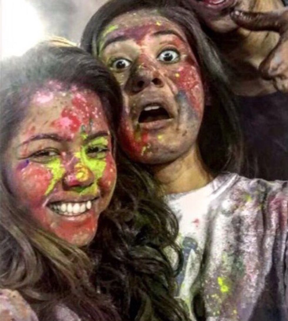 People throw powdered color on one another, while music is playing on the side and dancing. Holi is celebrated for a total of 16 days in the commemoration of the love between Radha and Krishna (until Rangpanchmi).