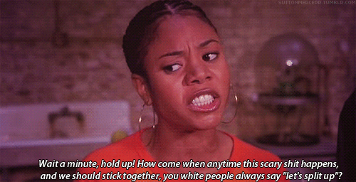 There's always that one person in every group that thinks it's a good idea to "split up". NO! If you watch enough scary movies, you will eventually see the pattern that splitting up actually is the worst thing you can do. Not only do you lose your group, but if you're alone then you have no one to help you in case something goes wrong. If you split up, you're on your own and there goes your life.