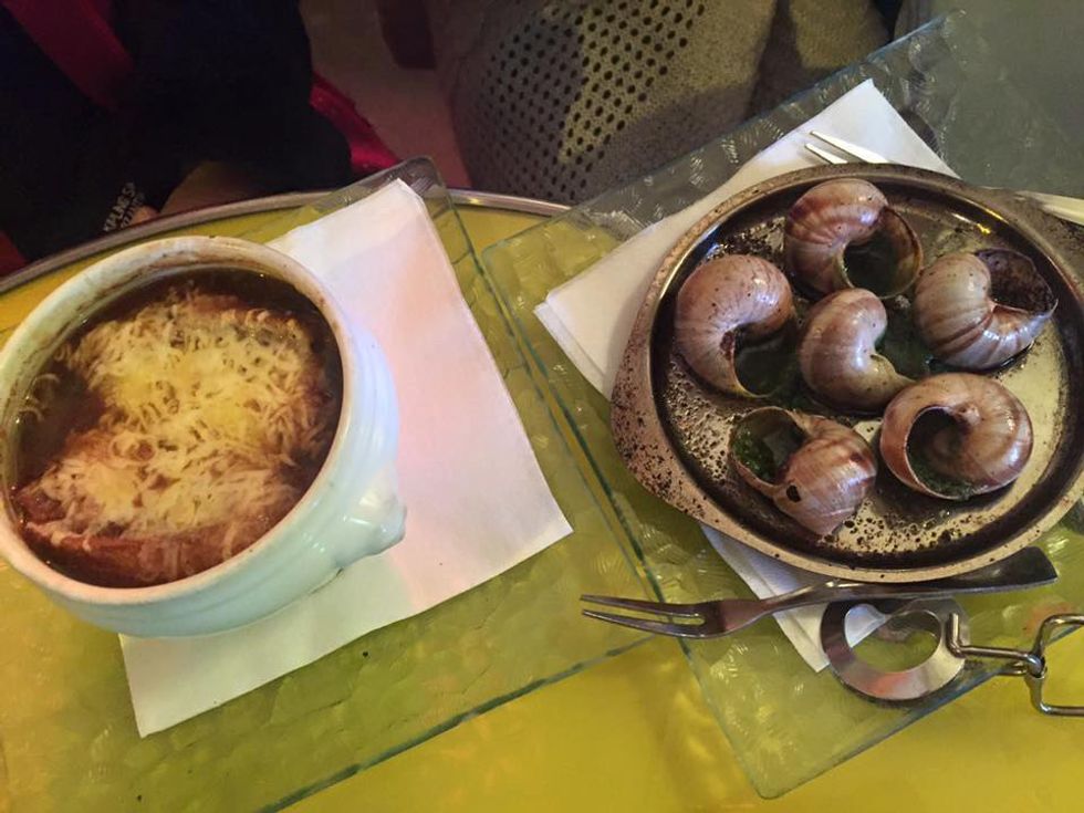 Escargot and French onion soup were not on the top of my list of "Things to Try When in Europe", yet here's the picture of when I tried them. I have to say that I was hesitant. In fact, I was even more hesitant when they were right in front of me, but hey, I was in Paris for the weekend. It sounded pretty cool to say "yes, I had escargot in France" so I did. Needless to say I was happy I had the courage to try them because they were good, but I still haven't gotten past the idea that I ate snail. Sorry, escargot.
