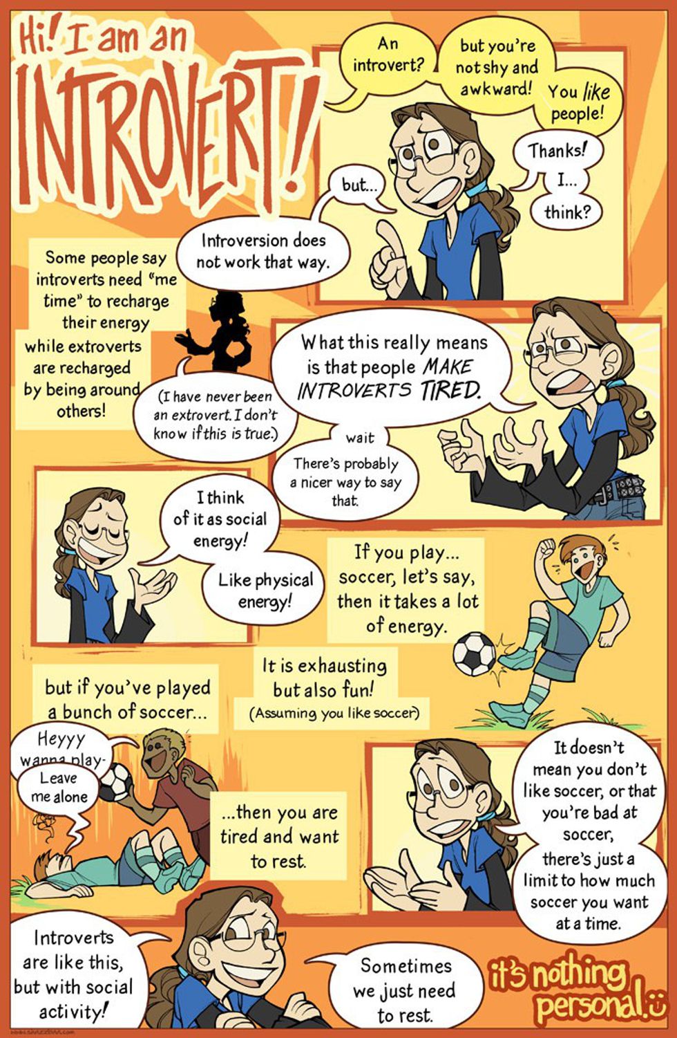 There are many different introverts, just like there are many different extroverts. I just hope this has helped some people realize that either way is okay. (There's even ambiverts, but that's a whole 'nother story).