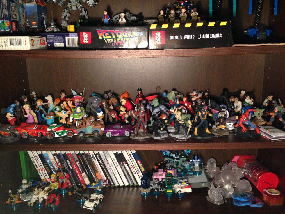Disney Infinity has the widest selection of characters, which means I needed to show them on an entirely different shelf, among my other video games (LEGO Dimensions gadgets seen at bottom too). Disney Infinity has expanded from classic to Pixar animated to Marvel to "Star Wars."