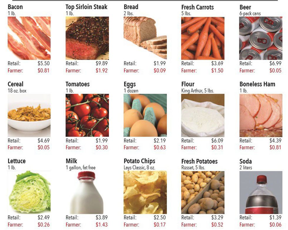 False. This would be true if we were living in the 1980's, but it is 2016 and farmers only receive $0.17 for every dollar. The rest of the money is for wages and materials for those processing, transporting, distributing, and marketing the product.