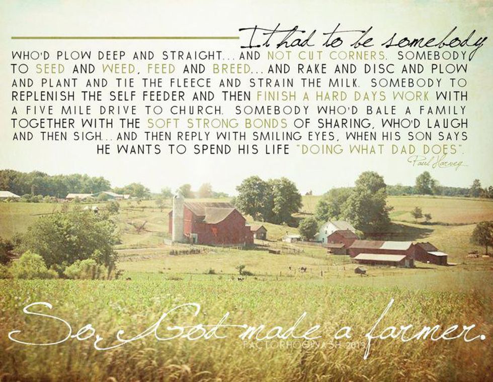 True. It is known as the three F's. You can farm all you want without faith and family, but you will not be successful. You need family to help, support, and care for you. A family that will bring out another sandwich and water to the field to make sure you eat, but also to spend time with you. Planting and harvesting are long days for the farmer, but also the farmer's family. The farmer provides not for just his family, but for all the other families, and the farmer's family knows that. Therefore, they treasure the time with their devoted farmer, even if it is just riding in the bumpy tractor or combined.