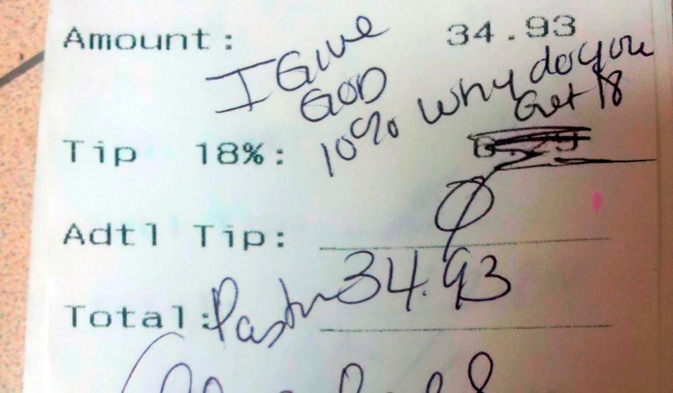 The bill is $40, you put your credit card down and she cashes you out, she returns the card with the receipt and a pen so you can fill out the tip portion of the receipt, you enter $0 in the tip portion because you figure she makes SOME money per hour, and that's enough, you don't have to leave her a tip.