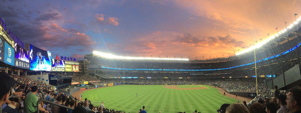 On the day of the game, there was a chance of thunderstorms, but that didn't stop us from attending a monumental game. In fact, the forecast was right because the storm hit us right as we were standing outside of the stadium. The rain came down so fast that I've never seen people in the ticket line move so quickly. Of course, once the majority of the people got inside the stadium, the rain stopped. The rain was kind of nice though because the humidity was relieved for a slight second. During this downpour was the ceremony for A-rod: you could hear the chants from the fans as we all walked into the stadium and although, we missed it by a few seconds, it was still amazing to hear.