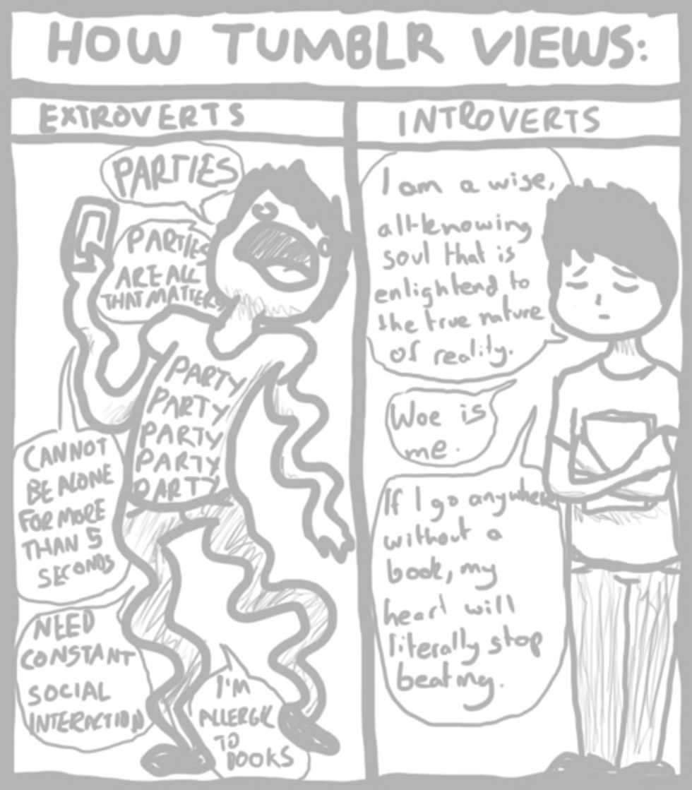 It's not all bad for the extroverted introverts, though. A major plus is not having to stick to the status quo of choosing and maintaining that one personality. For example, extroverts are typically expected to keep up the persona of always energetic and ready to party at any moment of the day. Introverts, on the other hand, stereotypically are viewed as staying in and going on Tumblr 24/7, and find themselves not even asked to go out because friends think they'll just reject the offer. But good news for the extroverted introvert! You can flip flop, whenever! The world is your oyster when deciding what to do with your life this weekend. It will keep your friends on their toes too. So you go, with your ever-changing awkward self!