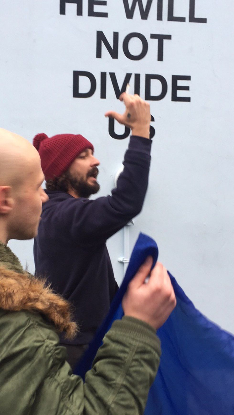 Shia came walking down the block smoking a cigarette, sporting "normal people" clothes and carrying a Starbucks cup that may or may not have contained Starbucks in it. Regardless of what was in his cup, Shia had a look of passion and persistence in his eyes. He returned from whatever he had gone to take care of and resumed his role as leader of this movement. He assumed his position in front of the camera and began chanting, "He Will Not Divide Us".