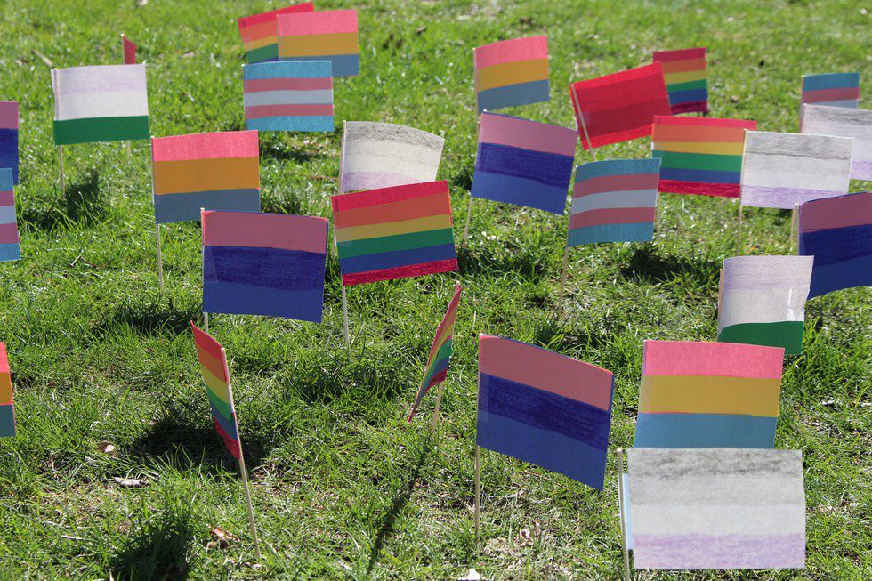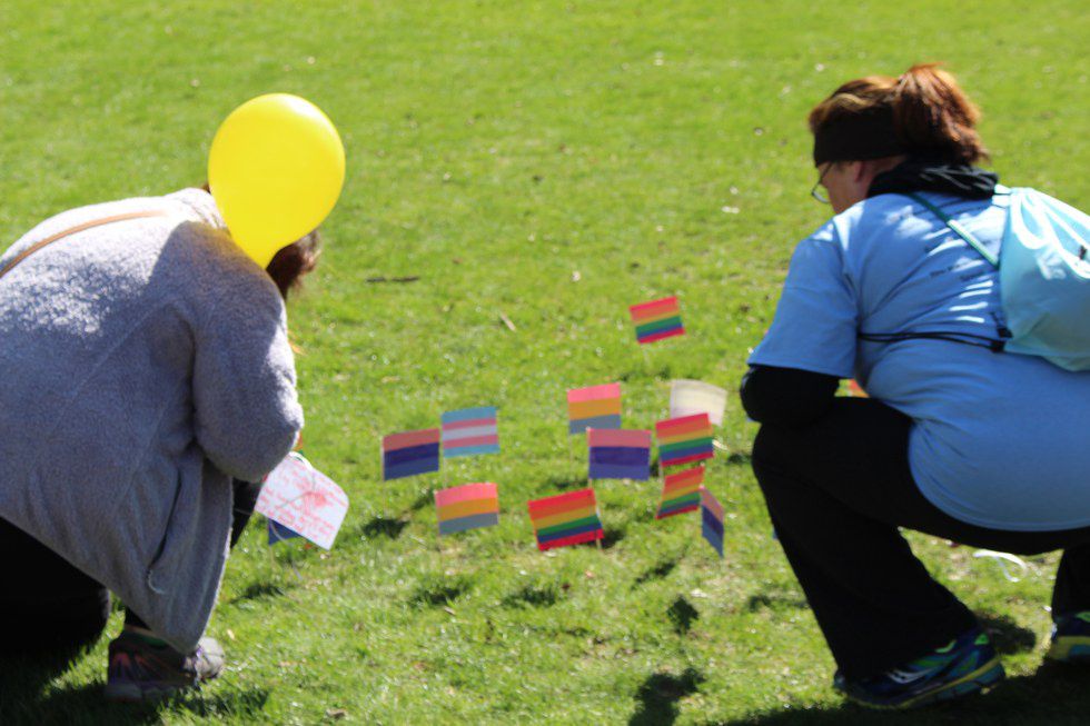I was so taken aback by these kids and their awareness and passion for this issue. I felt a little less alone. I felt a little less desperate. Their booth had pride flags made out of construction paper, and invited people to stick it in the ground to support people in the MOGAI community — either in memory of a lost loved one due to suicide who belonged to the MOGAI community, or in hope for their own self and their own struggle.