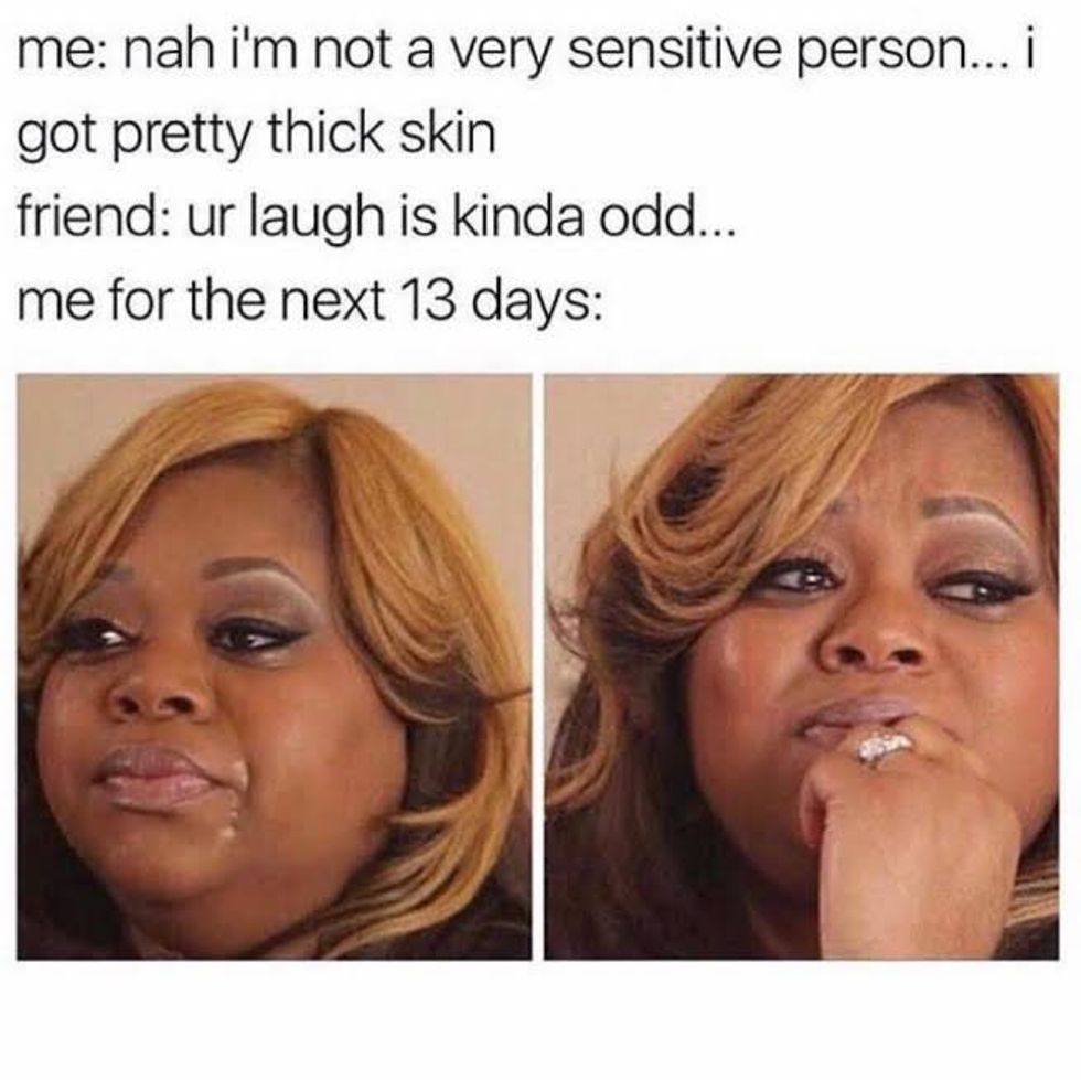 You're moody, emotional, and insecure. How could you think this meme is anything but you? You try to act like you're not sensitive but as soon as someone says anything about you, just like the meme, you think about it for a long time and it just really gets to you. After much research, I could not find who the lady in the meme is or how it originated.7. Leo