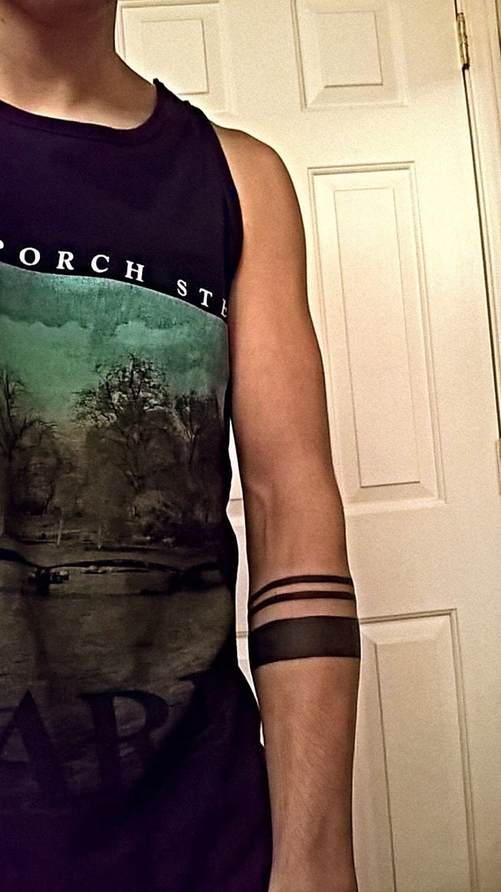 This is my tattoo, above. The first thing that’s important to me is that they’re exact measurements. With my arm at rest, the first band is exactly an inch thick, the first space is a ½ inch thick, each of the two bands are 400mm, and the second space is ¼ inch. Measurements of all kinds have always fascinated me -- the different measurements we use and that humans have used over time -- and I’m a little bit obsessive with things being exact, so it was important that they were even.
