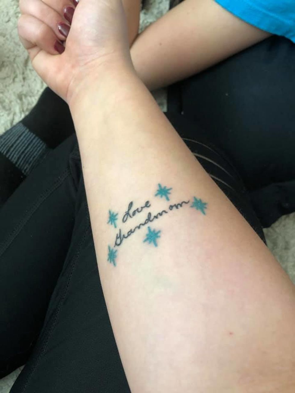 This was my first tattoo. The text in the tattoo is from the last Christmas card that my Grandmom gave to me. She passed away on that Christmas Day so I decided that was where I wanted to get her handwriting from. The stars surrounding the text are the same five blue stars that my Granddad also had tattooed on him. Once they both had passed away, I put the two together and that is where the design of the tattoo came from. My grandparents were some of the most incredible people in my life and influenced me in so many ways that they never got to see. Every single day I make a promise to make them proud of me and this tattoo serves as a reminder of that. On days that I feel down about myself or something going on in my life, I find myself looking at the tattoo and feeling their presence. It is so comforting to know that I have them with me everywhere I go.