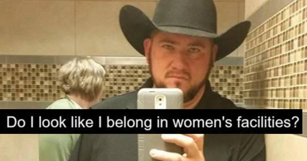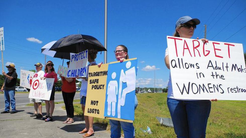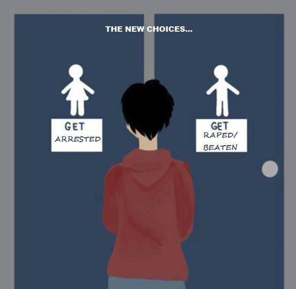 The protesting community is pushing a far-fetched image of pervy men in womens' clothing following women and children into bathrooms.
