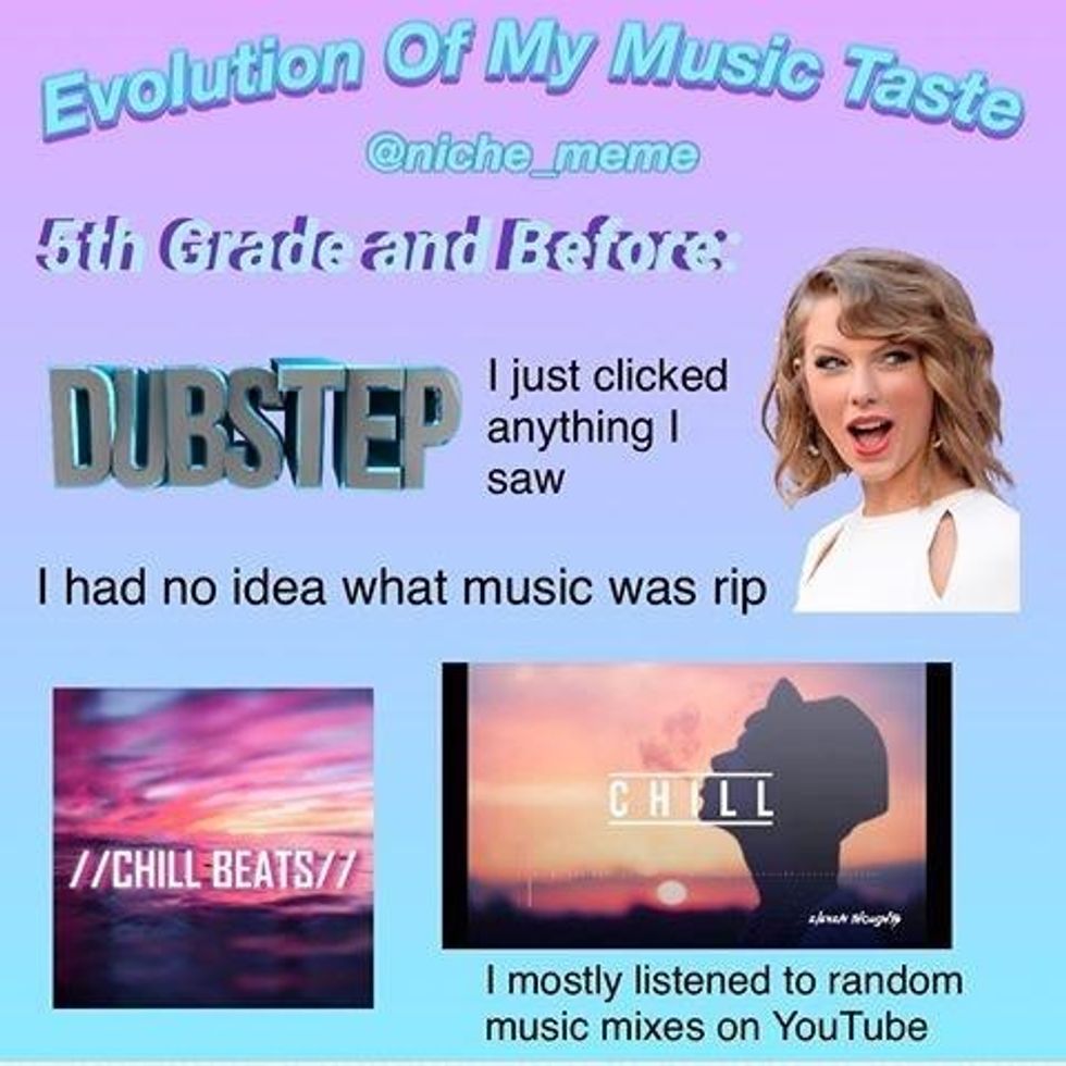 This niche meme is a perfect example of the specificity that goes into creating these things. The title "Evolution of My Music Taste" already prefaces that this is individual to the creator. This type of meme gives an inside look into people's lives. From this one meme we know that up until fifth grade the only music the creator listened to was dubstep, youtube mixes, and Taylor Swift. We also know that she looks down on her old taste in music (hinted from the "I had no idea what music was rip"). So, instead of writing in diaries now people are making… memes? It's a very odd concept to me, but these niche memes are extremely popular, especially among pre-teens. Honestly, the first time I saw one I thought it was a joke. How could anyone relate to these things? Isn't the whole purpose of putting content out on the internet relatability? To me, niche memes say something about our culture today.