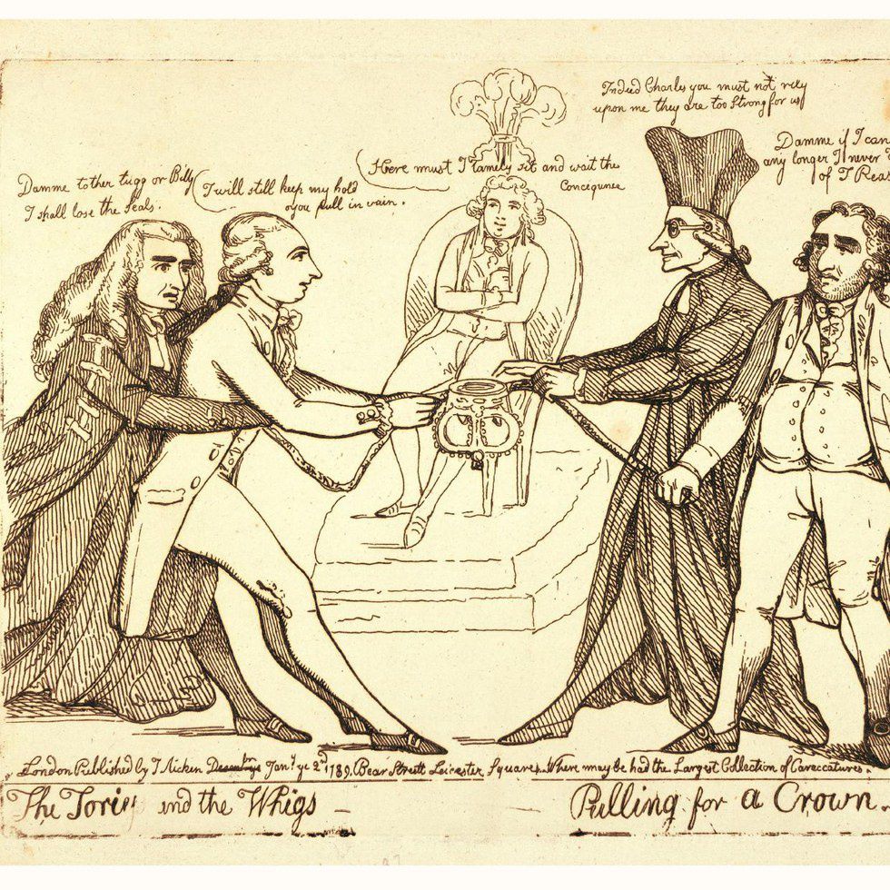 Take a look at opposing factions in England in the 17th century (we did come from England, you know). Whig was a term coined to represent those who wished to abolish the current trend of hereditary succession of the throne in opposition of James II. They were the rebelling group. Tory was a term used for those who supported the hereditary succession and wanted to keep things as they were.