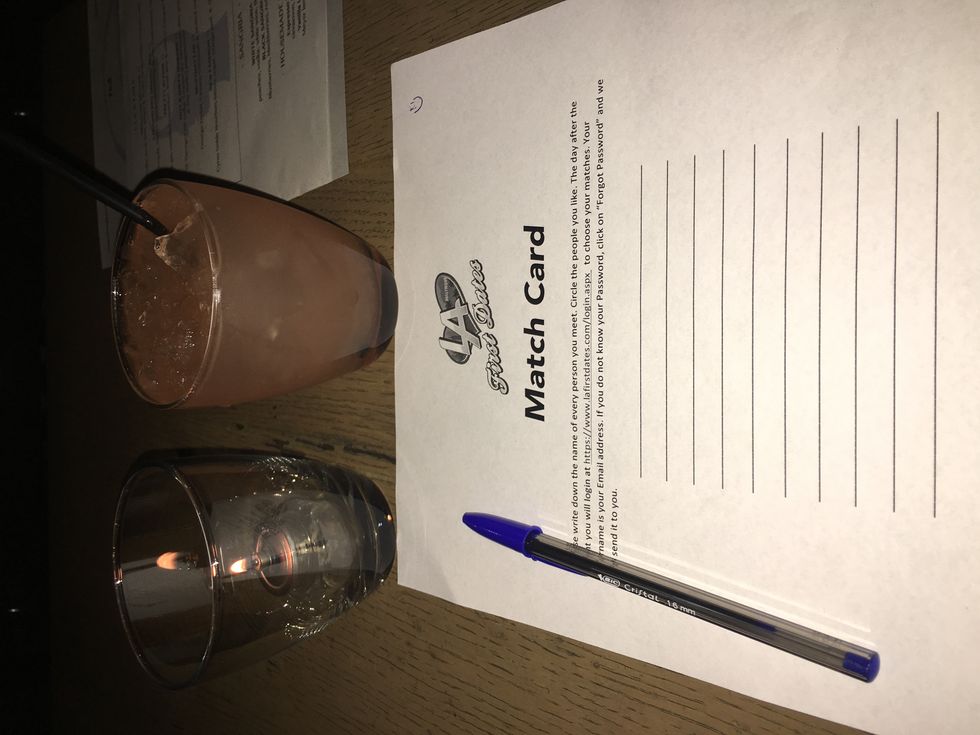 As the event began the host explained to us how it works. She explained the rotations and how to pick your match after. She also told the girls to give her a “look” if we needed saving. I then decided to get a drink to help me loosen up.