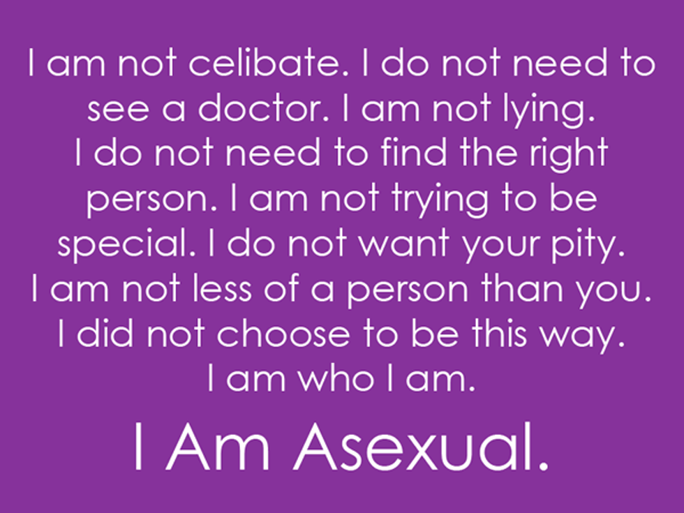 Asexuality is often marginalized, and those who identify as asexual are usually treated like there is something wrong with them when, in fact, there is not. Just like any other sexual orientation, asexuality is a valid identity. About one percent of the human population, which is roughly 70 million people, are asexual. Now, I do not know about you, but that seems like quite a few people to me. It is almost like it actually exists.