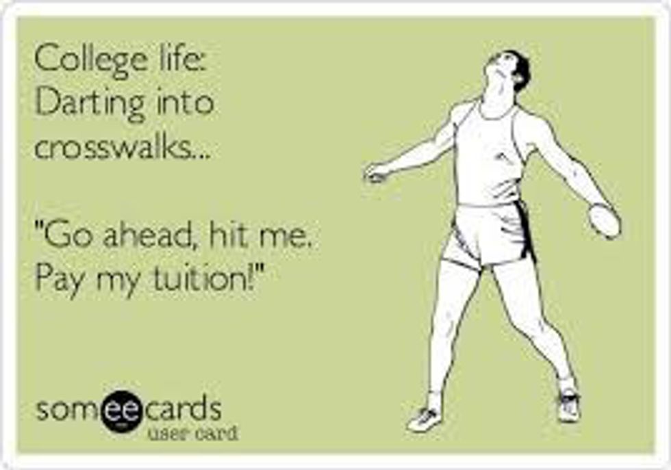 Like, are you trying to be run over? Don't answer that. When and only when you're in the driver's seat will you understand the pain associated with negligent pedestrians. Just imagine, you have two minutes to get to class and the only things standing (literally) between you and the parking garage is a slow walking Mac-wearing diva. Let that sink it. Walk fast. Look both ways.