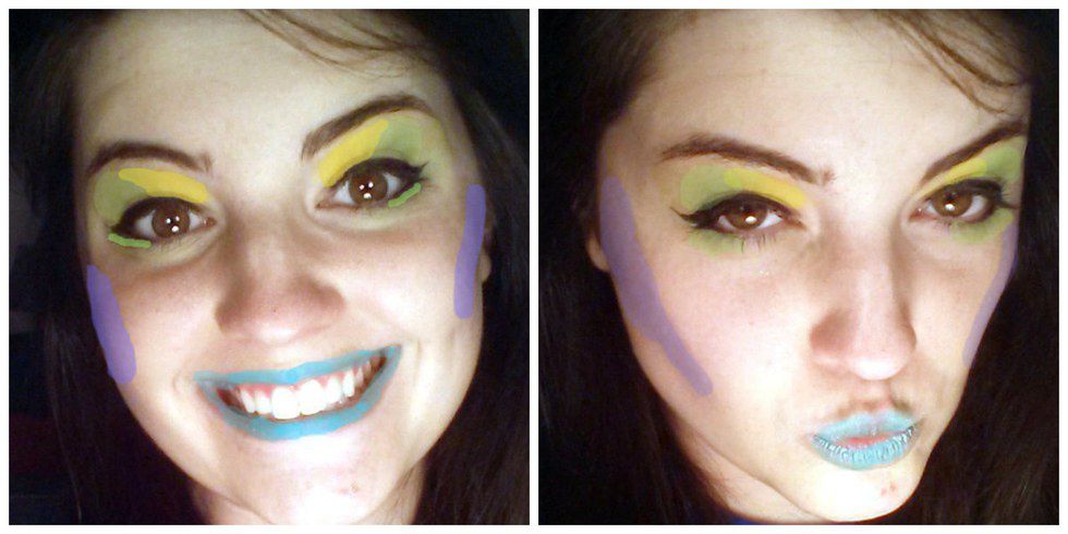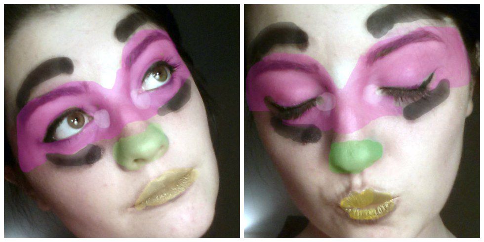This last look is for special occasions such as a wedding, the prom, the red carpet, or any formal event with some sort of dress code. From cheek to cheek, cover your entire eye area (including your brows) with a fluorescent pink. To really make those eyeballs pop, trace curves over your eyebrows and under your lower lash line in thick black lines. Highlight the corners of your eyes with white dots and make your nose pop by covering it completely in green. For the lips, mix whatever metallic colors you feel like! Go nuts! It's a special day for you or someone you know! Nothing gives off that old Hollywood glamour vibe more than overly defined features!