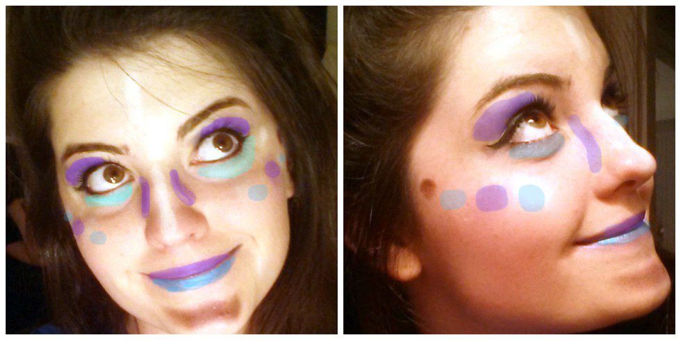 This look is specially crafted for a night out with your gal pals! Inspired by the movie "Zenon," take your makeup to the moon with metallic blue and purple pigments. Stay on top of the trends by putting purple on your top lip and blue on your bottom lip, with a matching pattern for your eyes. Don't forget to contour your whole face with purple, while highlighting in blue! To go the extra light year, dab dots onto your cheekbones in alternating colors. With this makeup look, your peers are sure to think that you are out of this world!