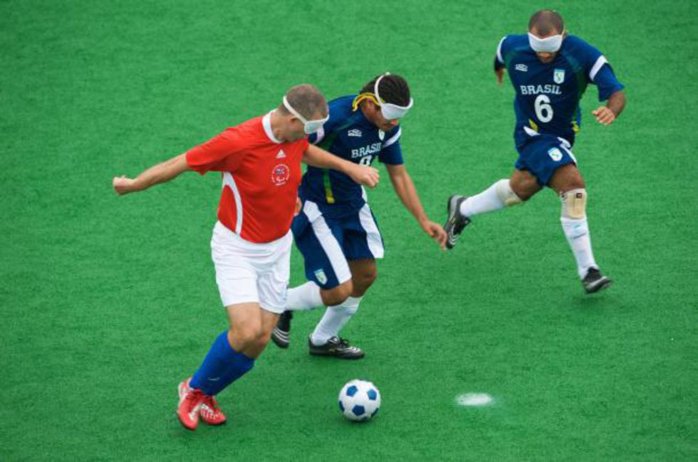 This sport is also known as blind football. Each team is comprised of four visually impaired players who wear masks (mostly for fashion reasons, but also to make the playing field even) and a sighted goalkeeper who is allowed to give verbal instructions. Each team has a coach and a designated guide who are also allowed to give verbal instructions. The ball makes a sound so that the athletes can track it, and the audience has to keep completely quiet!