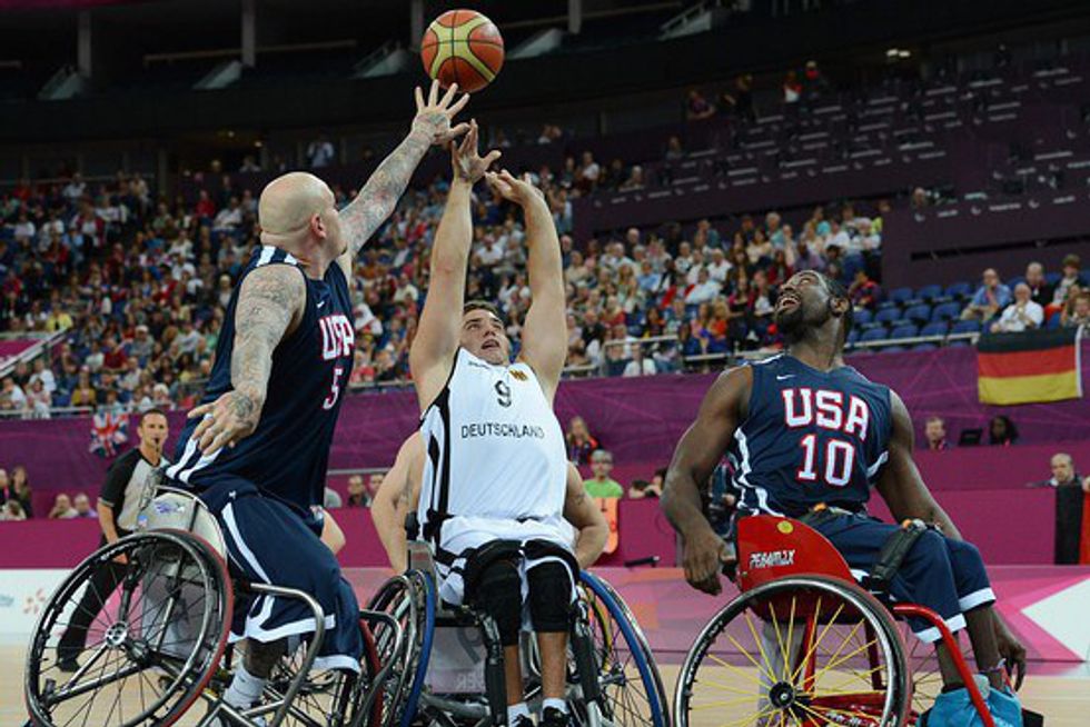 Wheelchair basketball is another sport that has been a part of the games ever since the first edition in 1960. The basket height is the same as basketball, 10ft. Dribbling and traveling are adapted; players must bounce, shoot, or pass every two pushes of their chair.