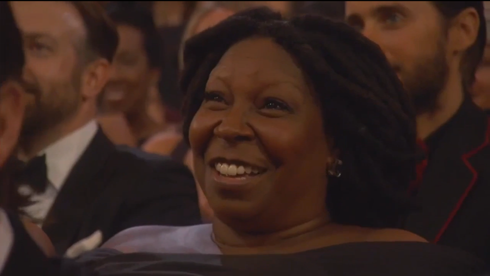 Now, let's talk about those close-ups we get to see of famous people reacting. When Rock's talking about employable people who don't protest things, we get a great pic of Cate Blanchett's new haircut. The "Kevin Hart's laughing, this isn't bad!" close-up. When he mentions Rihanna, they cut to Latina actresses, including Sofia Vergara. Leo gets his own, unsmiling close-up when they mention him. There's even a quick cut from four fun people to a one shot of Whoopi Goldberg when Rock starts talking about rape and lynching.