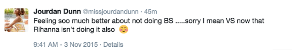 Some controversy around the the show sparked when angel alumni, Jourdan Dunn, tweeted this. She deleted the tweet but fans had already re-tweeted and screenshotted her post. Not sure if Jourdan has bad blood with VS, but it seems like her days of wearing wings are over.