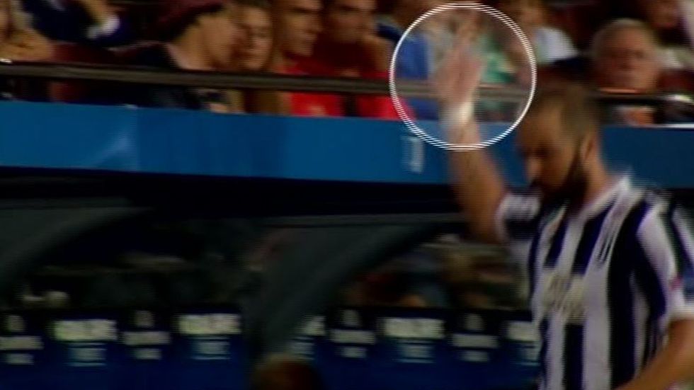 Juventus Striker Gonzalo Higuain rightfully gives the Barcelona crowd the middle finger as he takes his place on the bench after being substituted on 9/12/17 during Juventus' 3-0 defeat at Barcelona Credit: La Marca