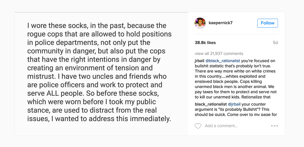 Take, for example, the statement that Kaepernick made when the conversation switched to him sitting to the socks he was wearing. While it's nice that he's using his public profile to make a statement, it only does so much. And writing a check to charity can only go so far. If Kaepernick wants to continue to contribute to the conversation about racial inequality, he'll have to become an active participant in the fight for equality. Take, for example, LeBron James, who has found creative ways to funnel money into his hometown, the least of which included bringing home a championship ring.