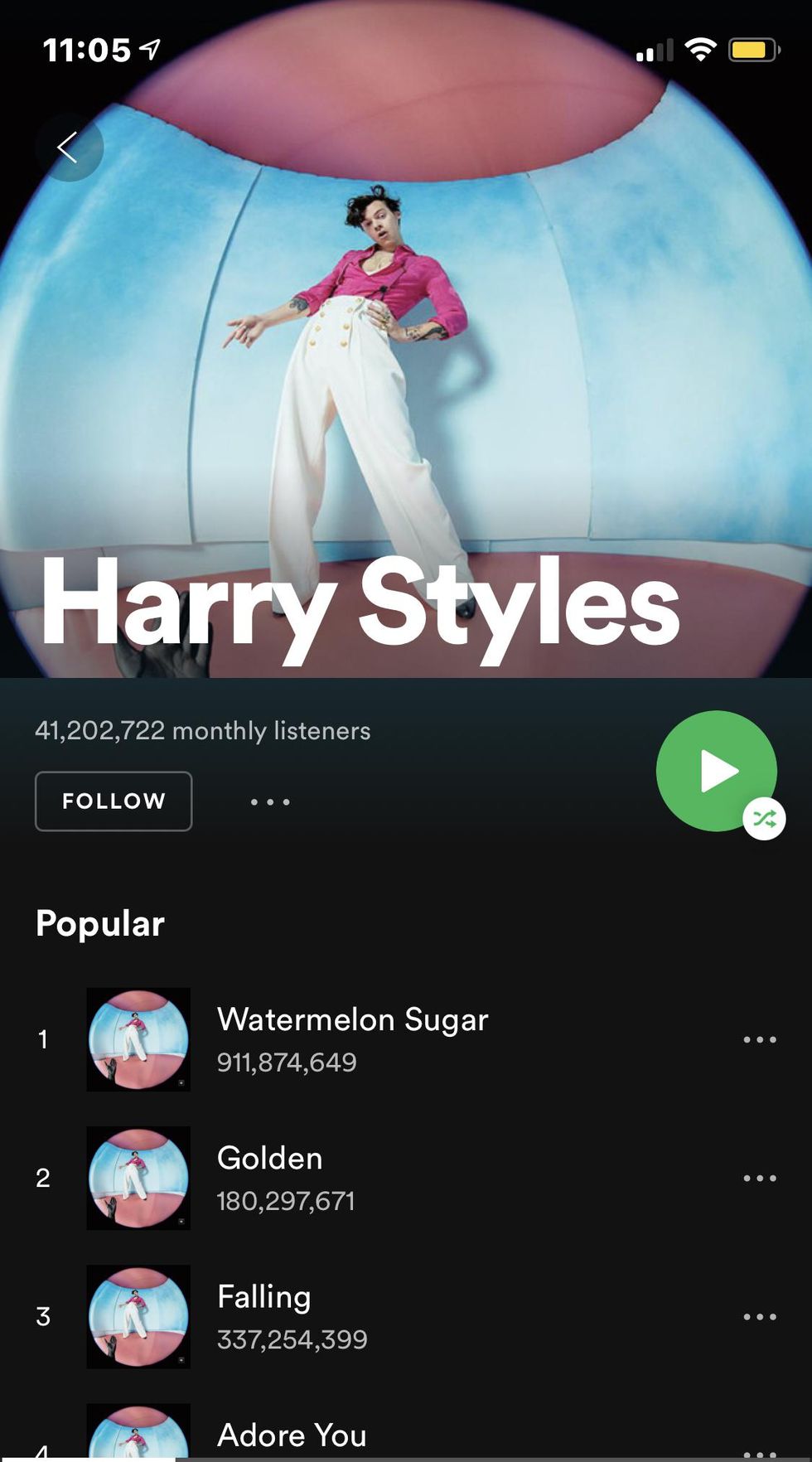 Speaking of One Direction, if your top artist was Harry Styles, you are a former One Direction superfan and you cried when they announced they were taking a break. When Harry released his banger of an album this year, you immediately overplayed it, which is why your top 5 are all songs from that album. You definitely pride yourself on the fact that your top song wasn't Watermelon Sugar which is why you posted your Spotify Wrapped.