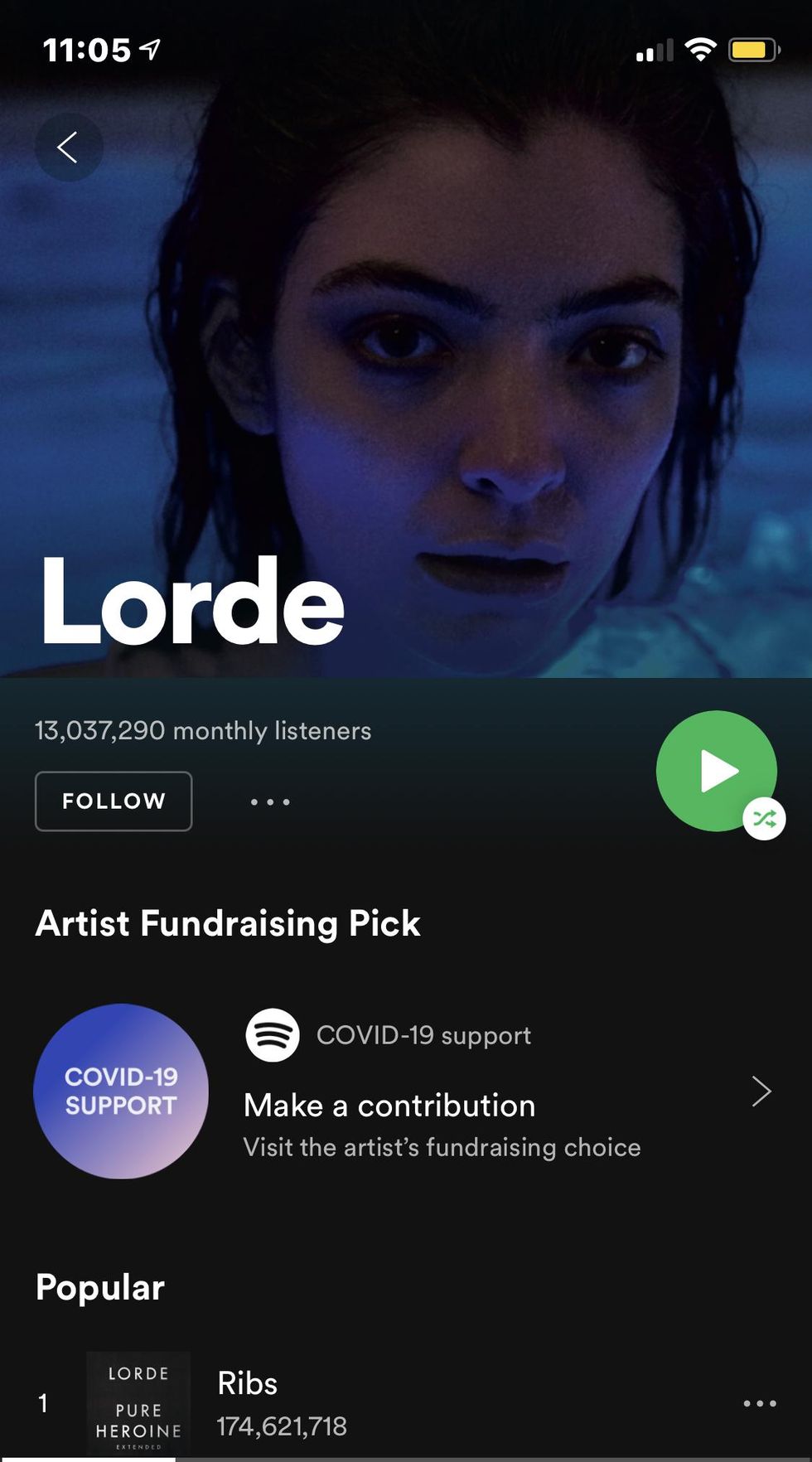If your top artist is Lorde, there's a good chance she has been your top artist for the last couple of years considering she hasn't come out with music since 2017. You probably disliked the song Royals when it came out but will defend every other song like it is your child. Like Frank Ocean, you hope this year will be the year she finally releases another amazing album and to pass the time you listen to the same two albums.