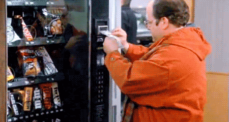 WOW that was a tough workout. All you can seem to think about after working out is eating. Thankfully, there's a machine for that. Punching in those numbers really gets the blood pumping to the body, mind and spirit. The single squat to retrieve your candy bar is probably the most important thing you'll do all day. Not to mention the gentle precision it takes to peel back the wrapper to a candy bar and ruin that workout can really leave a person winded.