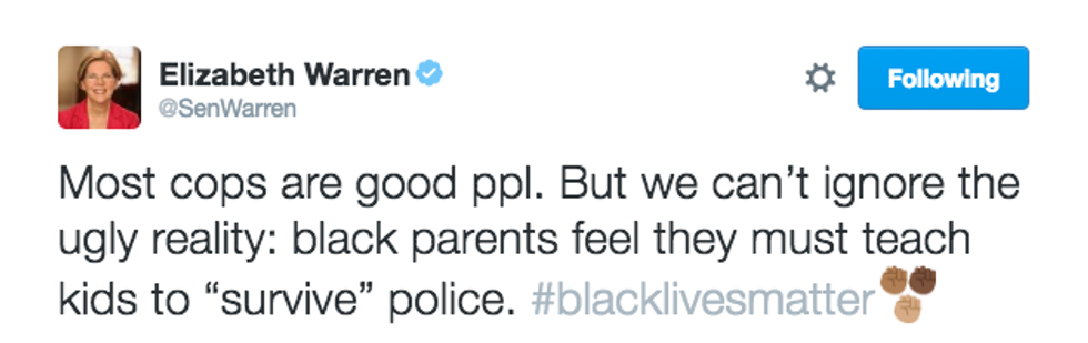 Most people today understand that there's a huge difference in how kids and adults of different races are treated in society today. As young children, we're all (including black kids) completely innocent and carefree, living in a happy safe world. But as years go by and everyone grows older, black kids suddenly have to start watching out for themselves around the police and racist individuals. Even parents start feeling the need to teach their kids how to survive while being black because, these days, saying the wrong thing or making the wrong move could result in being shot dead. Here's a tweet that Massachusetts Senator, Elizabeth Warren, posted just a few days ago reflecting on this week's tragedies.