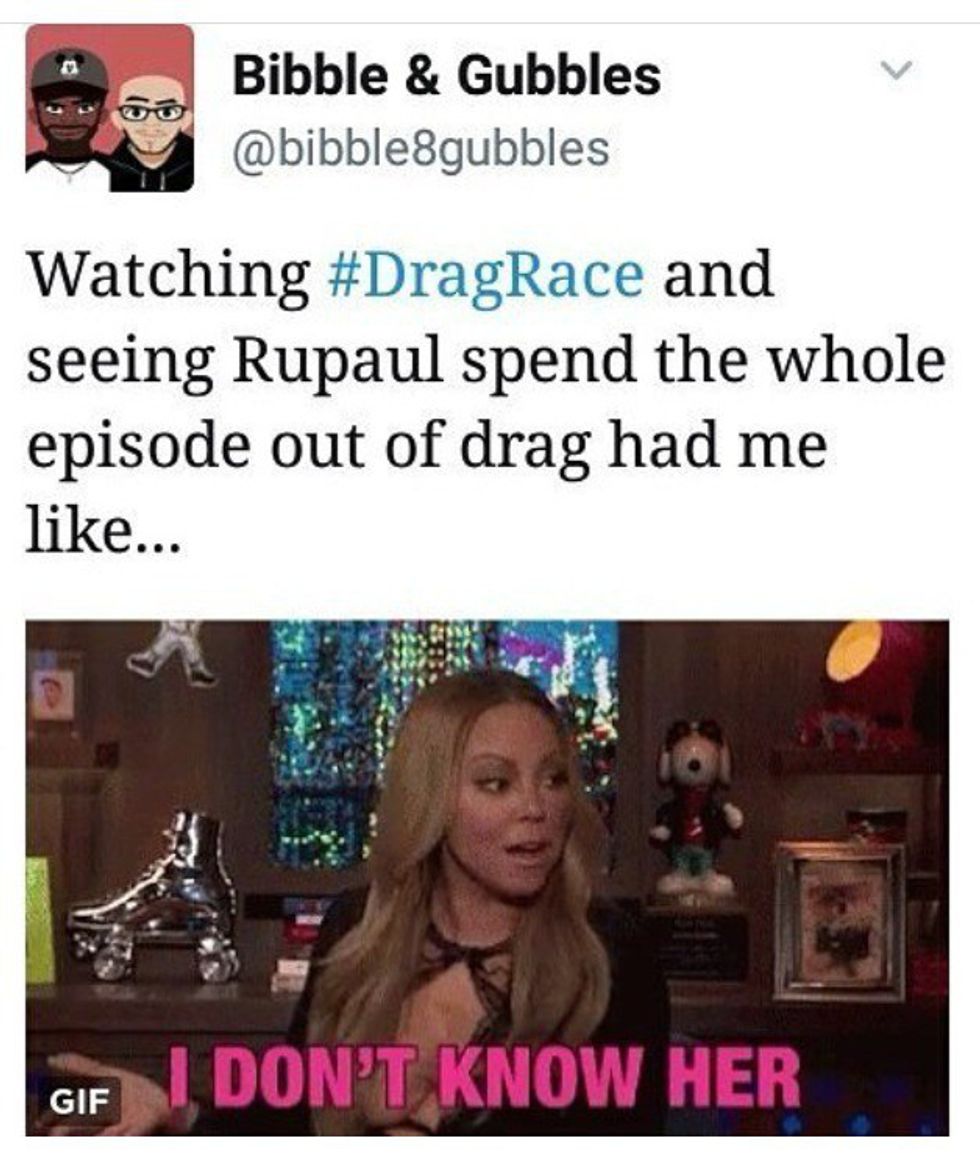 One thing that was the most confusing, was the fact Ru was not in drag. Fans of the show know that in the work room Ru is never in drag, just a nice suit. However, on the main stage Ru always looks her best in some time of gown with big hair. This time Ru was not in drag at all. And most of the fans feelings can be described by this: