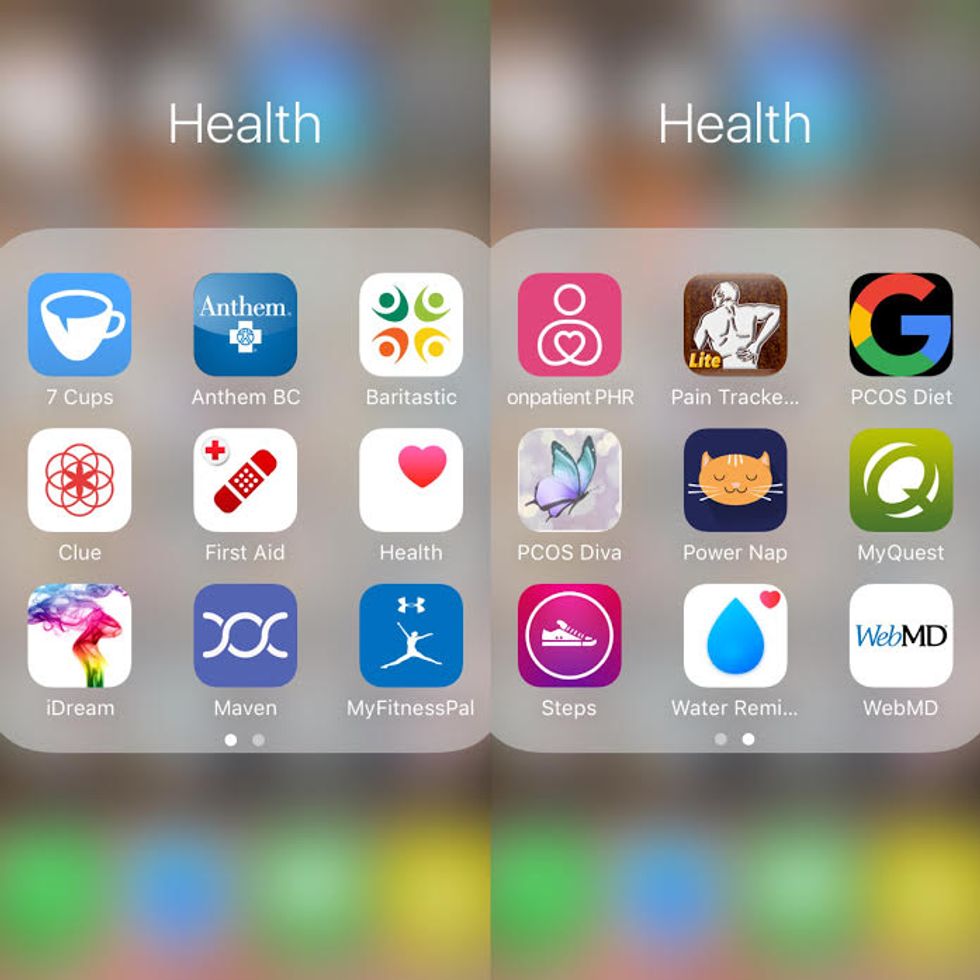 In this folder, I have 7 Cups of Tea, which is an app that lets you talk to people when you want to or need to vent, but can't talk to anyone for whatever reason; Anthem BC, which is basically an app for my health insurance; Baritastic, which is a meal planner and meal tracking app for people who are planning on getting or have gotten bariatric surgery; Clue, which is a period tracking app; Red Cross First Aid; Apple Health; iDream, which is a noise maker app for when you're sleeping; Maven, which is an on-demand women's health app that basically lets you video chat with any type of physician you need (NOTE: IF YOU USE MY CODE WJCH YOU CAN GET AN APPOINTMENT FOR FREE!); MyFitnessPal; onpatientPHR, which is a patient portal for a specialist I saw; Pain Tracker Lite, which is a chronic pain tracker; PCOS Diet and PCOS Diva are apps for women who struggle with PCOS; Power Nap, which is a timer app for taking quick power naps; MyQuest which is a patient portal for Quest Diagnostics; Steps, Water Reminder, and WebMD.