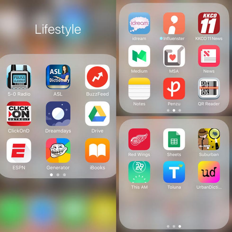 5-0 Radio is a police scanner; ASL Dictionary; Buzzfeed; ClickOnD is a Detroit news app (I have this app because I worked there last summer and like to keep it in my prayers and such); Dreamdays is a countdown app; Google Drive; ESPN; Meme Generator; Apple iBooks; iDream, which is a dream interpreting app; Influenster, which is a great app where they send you free stuff for you to review; KKCO 11 News, which is a news app for the town in Colorado I used to live in; Medium, which is another blog site; My Subscription Addiction, which is an app I downloaded because it has a list of a ton of subscription boxes; Apple News; Apple Notes; Penzu, which is a journal app; QR Reader; Detroit Red Wings; Google Sheets; Suburban Bug Identifyer, which I downloaded because in my old residence I would find all these little bugs that would fly into my room (I never figured out what the bugs were, but oh well); This AM, which is another news app; Toluna, which has surveys, and UrbanDictionary.