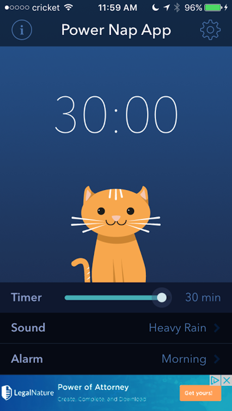 The next app I will focus on is Cat Nap. As you can see, it has a little cat and a timer up to 30 minutes. My go-to length of a cat nap is 30 minutes, I love the Heavy Rain white noise and the Morning song.