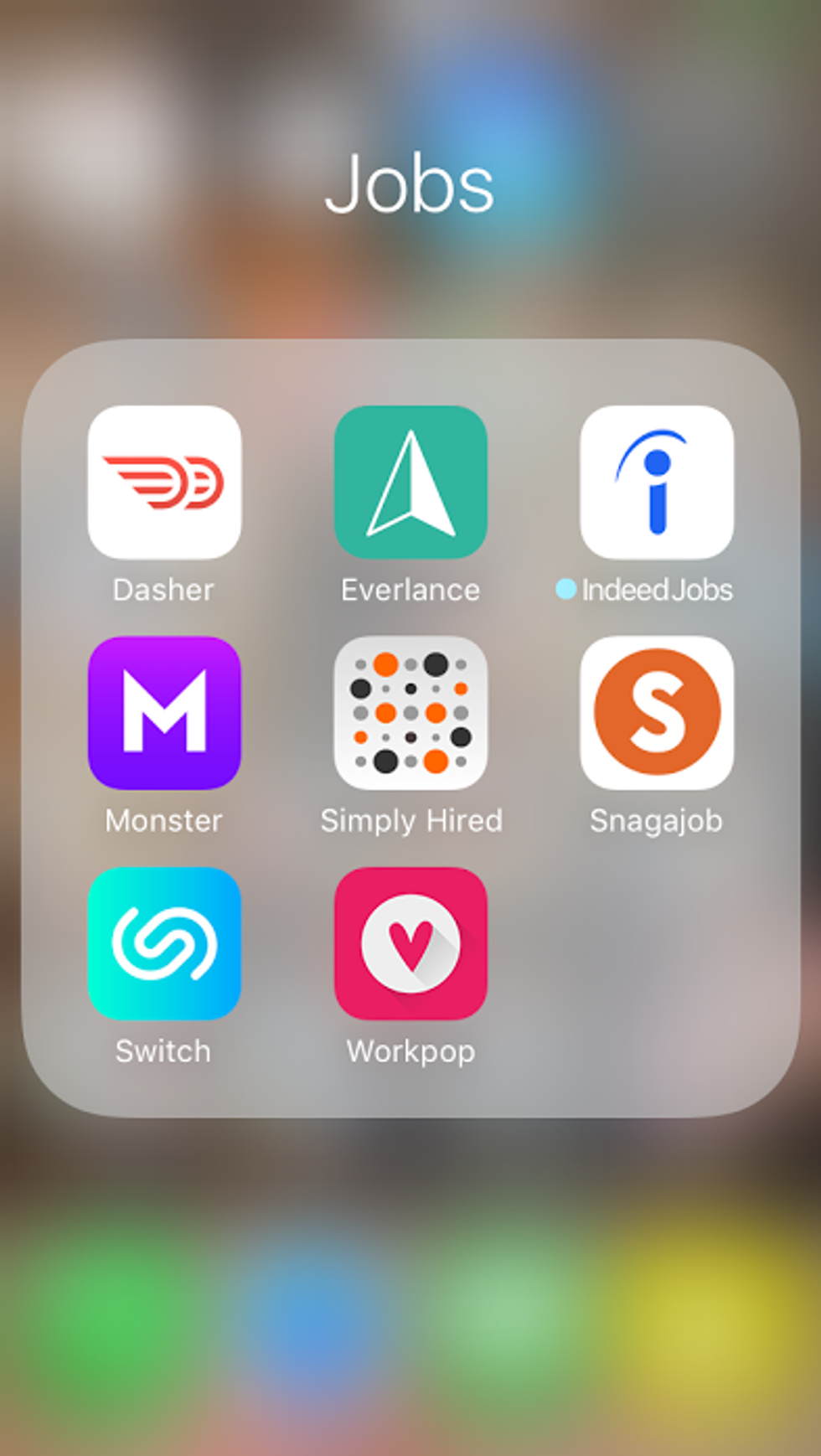 This is where I have the Dasher app for DoorDash, Everlance which tracks my miles; Indeed, Monster, Simply Hired, Snagajob, Switch, and Workpop are job search apps.