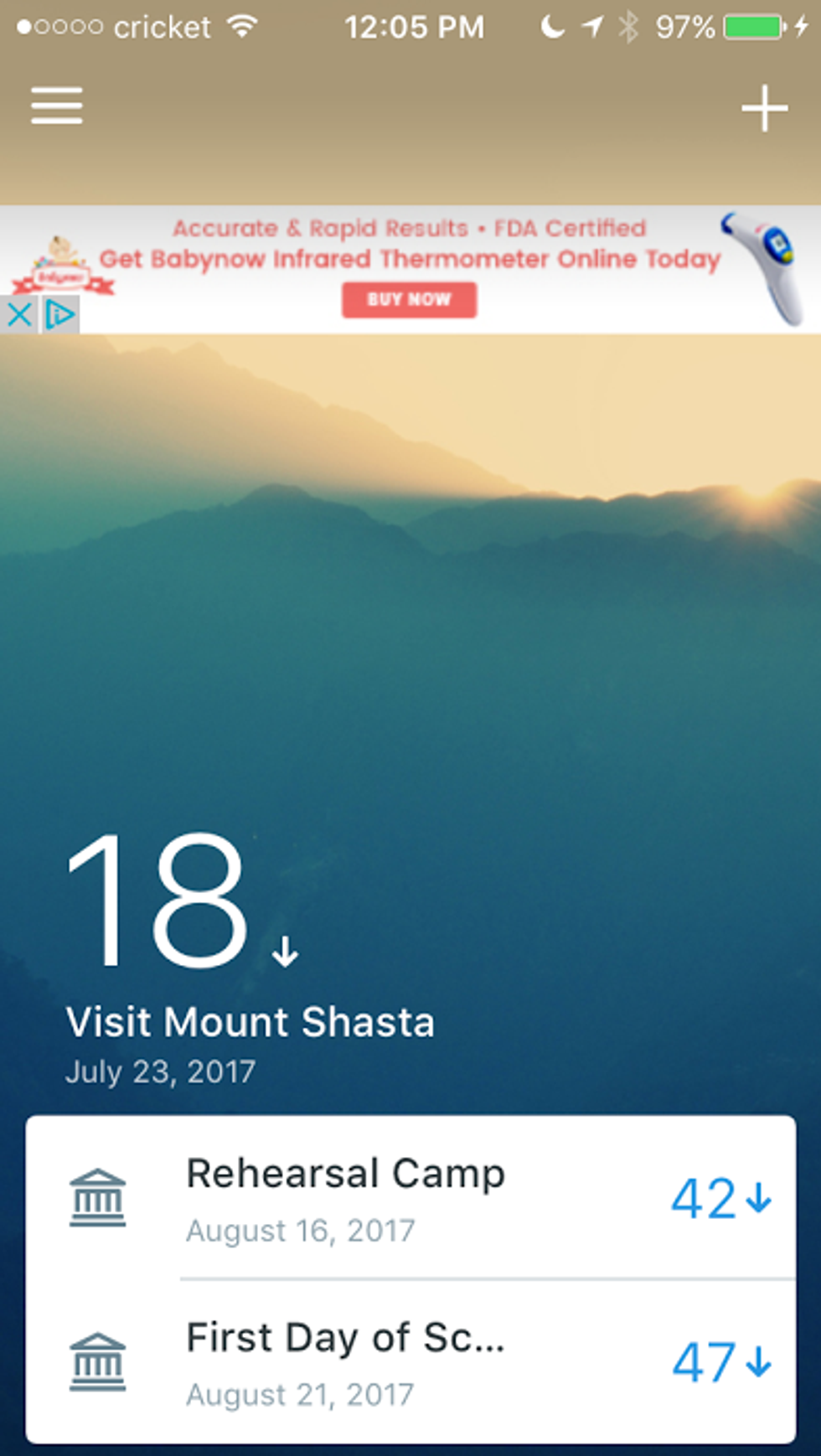 Below is the app, DreamDays. As you can see, my soonest event that I'm counting down to is a visit to Mount Shasta. Then, I have a countdown to Rehearsal Camp for the music department at Jessup, and finally the first day of school.