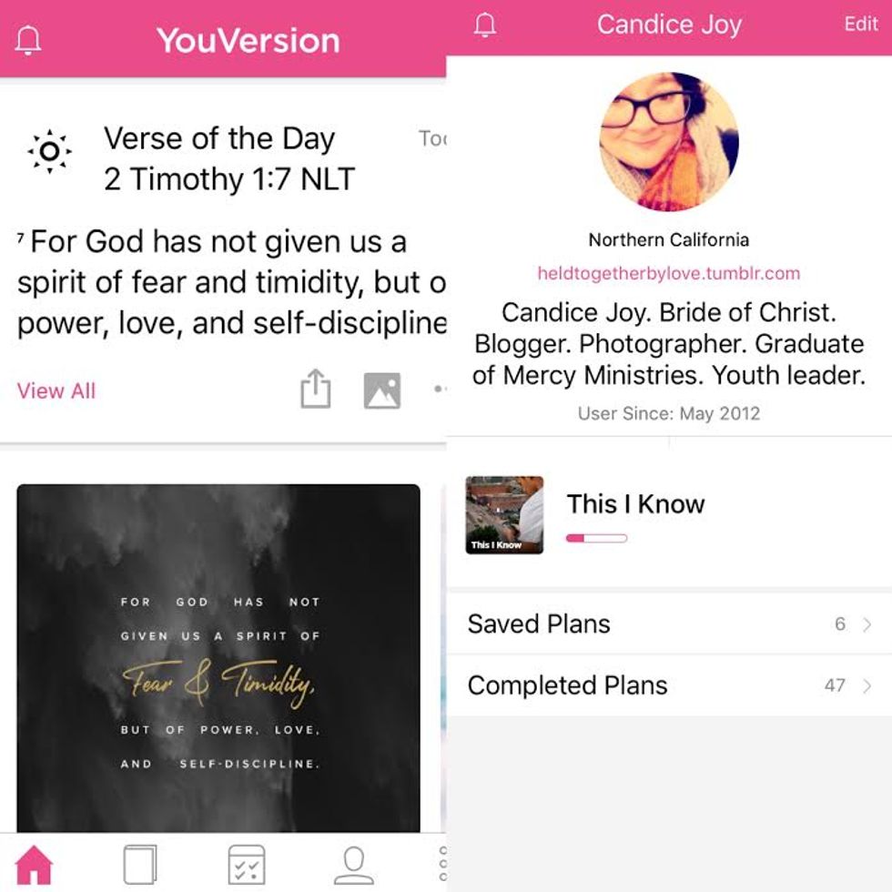 I'm going to focus on the YouVersion app, which is probably the app I use the most. You can see the Home Page has the Verse of the Day, as well as things your friends have been doing, such as the reading plans they're going through and verses they've highlighted. Next, you see my profile which has a short bio about myself, then you see the current reading plan I've just started.