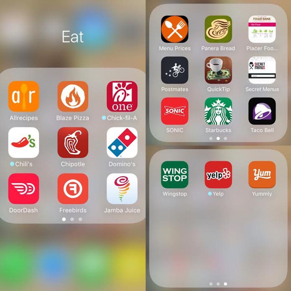 Most of the apps are pretty self-explanatory, so I will only briefly explain those not associated with restaurants. Allrecipes is a recipe generator, DoorDash is an on-demand food delivery app, Menu Prices is a website I added to the folder so I can quickly look up menu prices when I'm on a budget, Placer Food Bank is another website I've added so I can find free food when I'm on a super-tight budget, QuickTip is a tipping calculator, Secret Menus is another website I mainly use for Dutch Bros drink orders when I have no idea what I want to get, and Yummly is another recipe app.