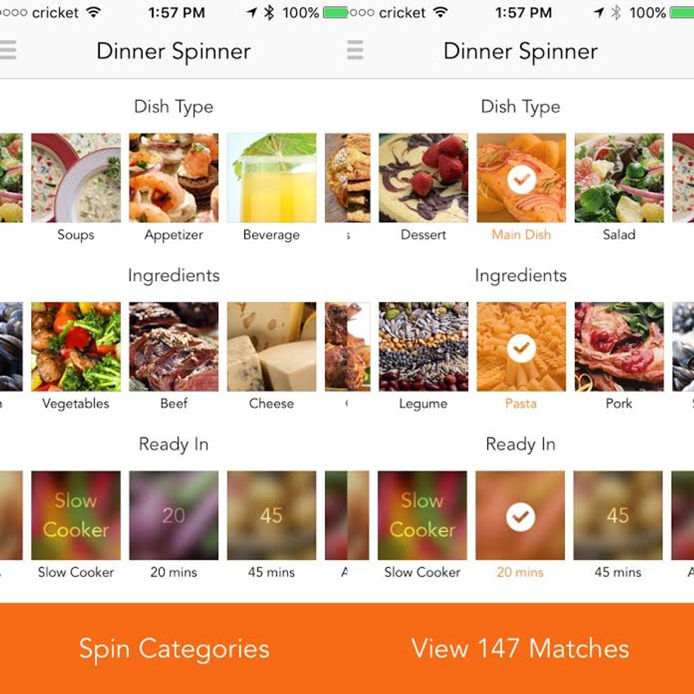 Let's look at the Allrecipes app. My favorite feature of this app is what they call the Dinner Spinner. They have a category for Dish Type, Ingredients, and Ready In. I spun the categories and came up with the Main Dish made with Pasta, and it should take about 20 minutes to make.