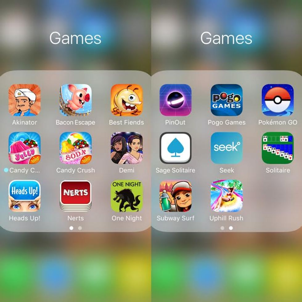 The final folder I will highlight is my games folder. This folder has 17 apps in it. I will list them all, but I will focus on 3 of them. On the first page of the folder I have: Akinator, Bacon Escape, Best Fiends, Candy Crush Jelly and Soda, Demi Lovato Path to Fame, Heads Up, Nerts, and One Night Werewolf. On the second page, I have: PinOut, Pogo Games, Pokemon Go, Sage Solitaire, Seek, regular Solitaire, Subway Surfers and Uphill Rush.