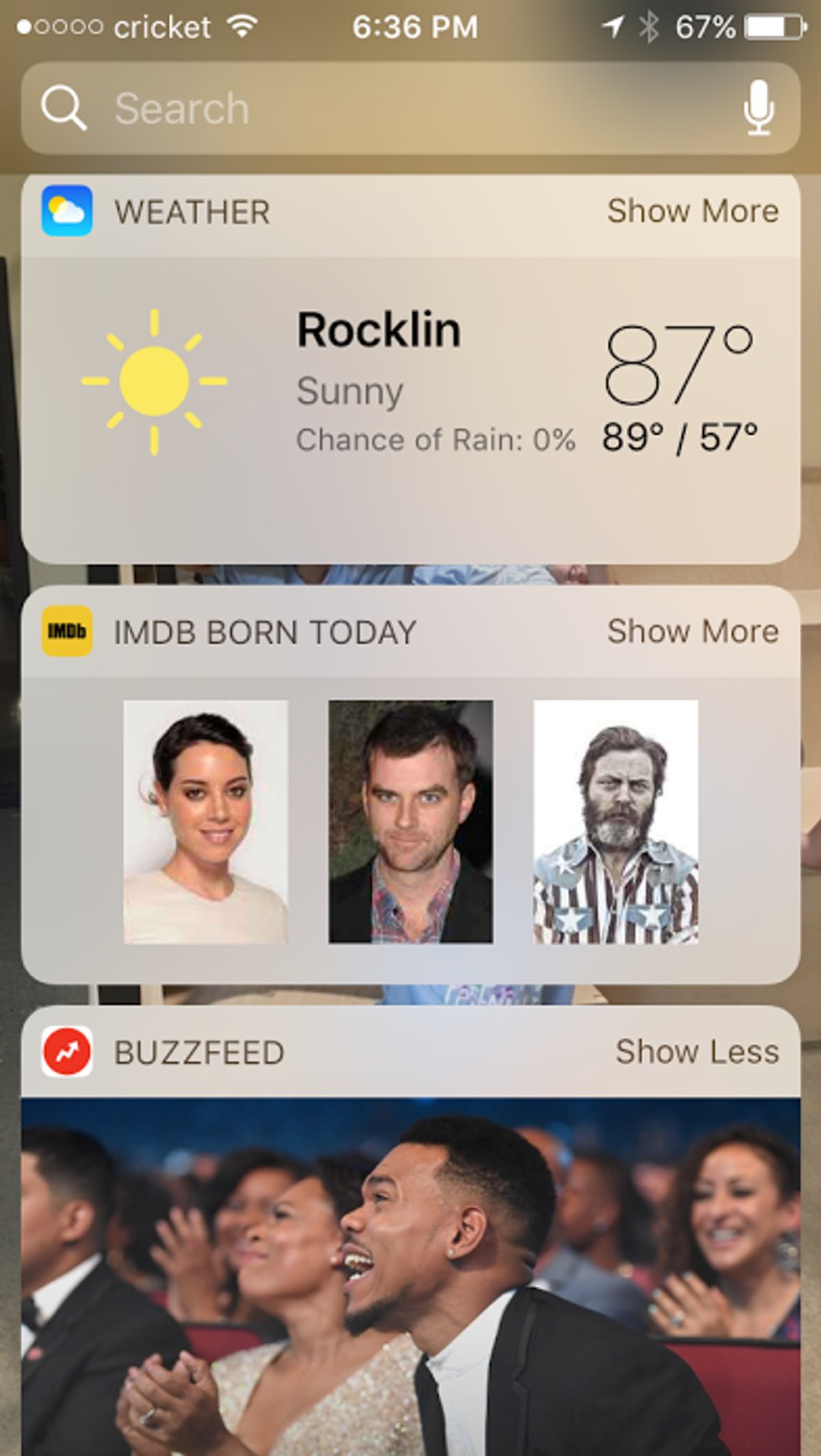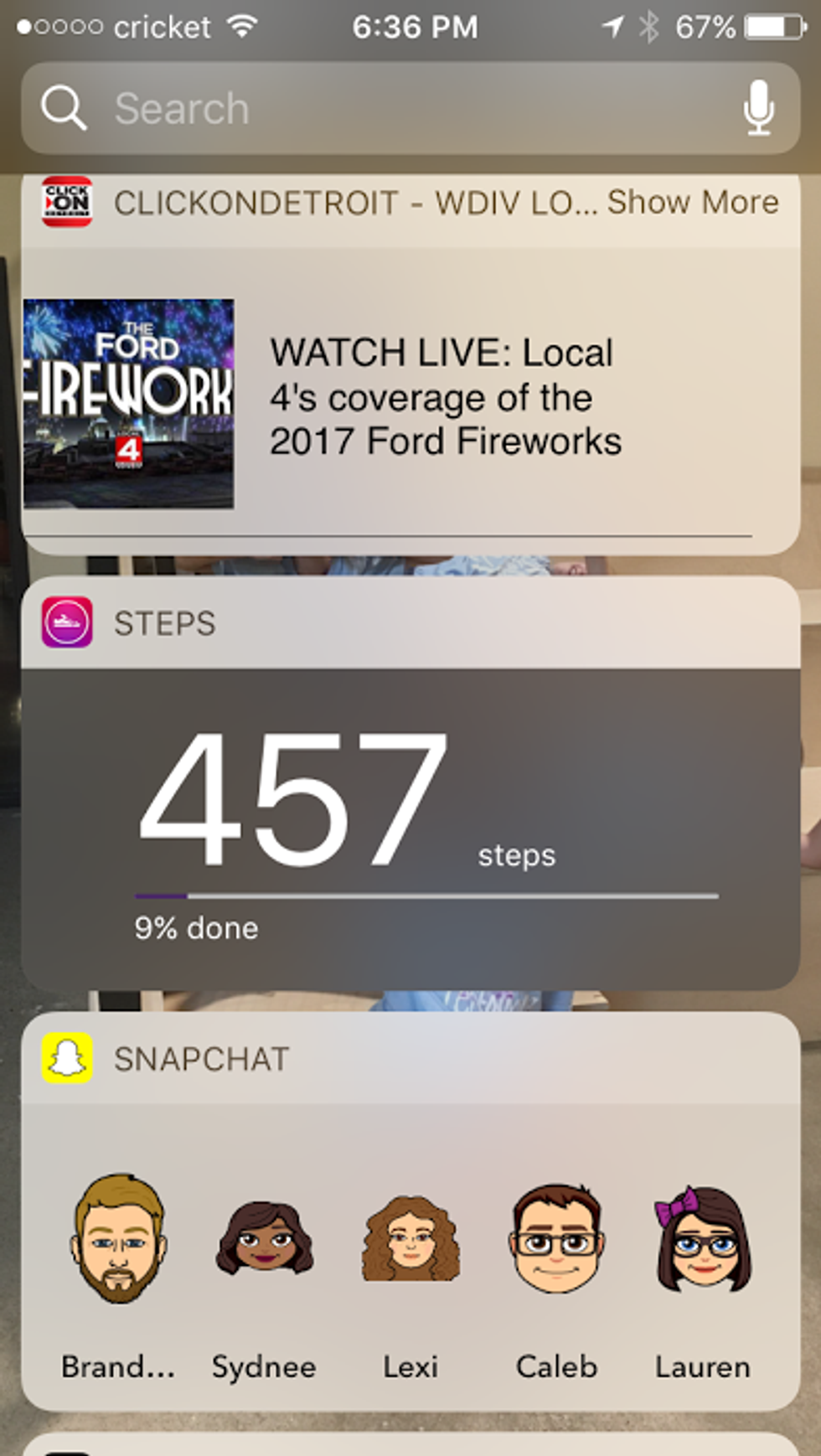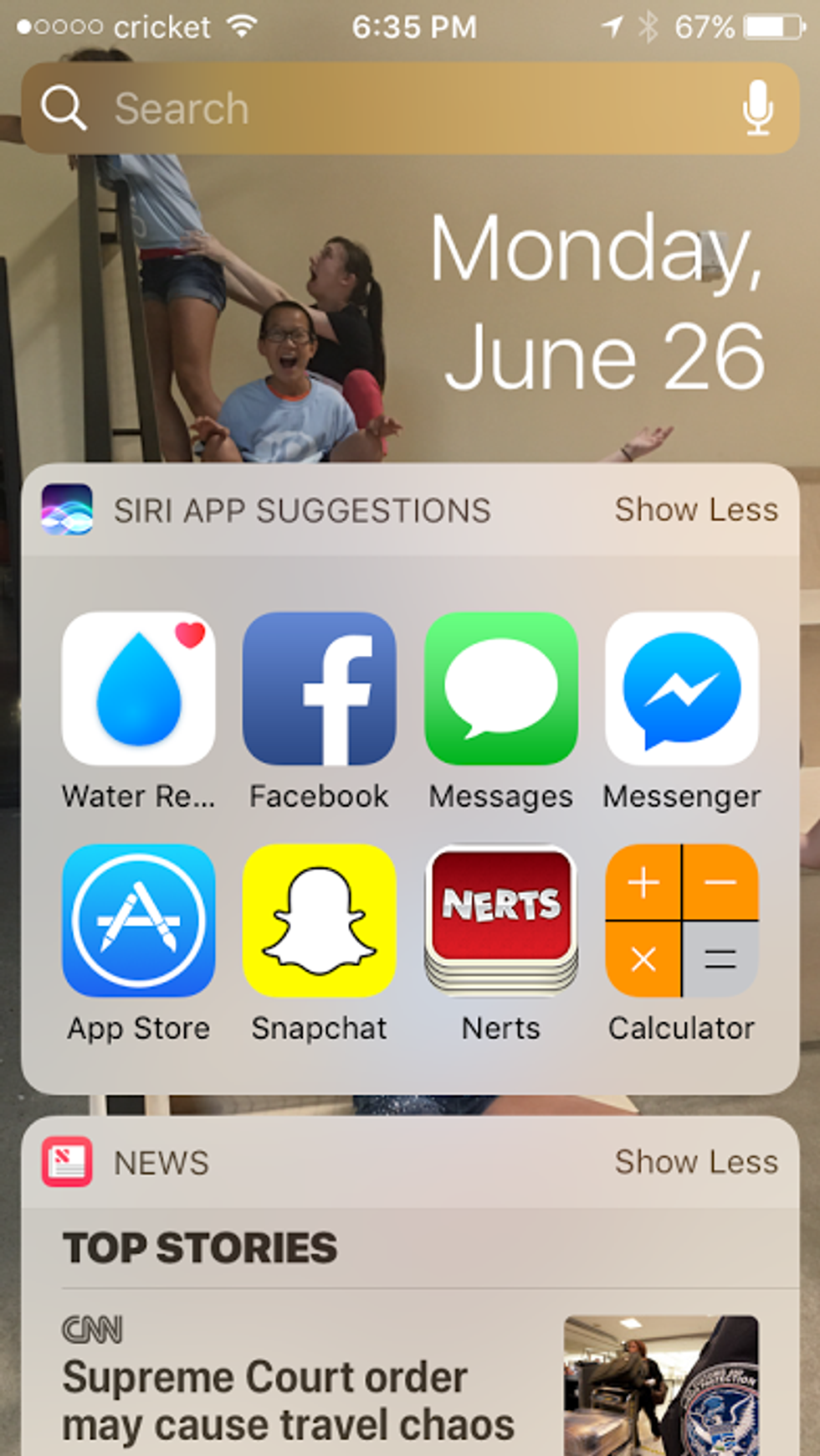 Next, we'll go over to my Widget page. First up, we have my most recently used apps: Water Reminder, Facebook, Messages, Facebook Messenger, App Store, Snapchat, Nerts, and Calculator